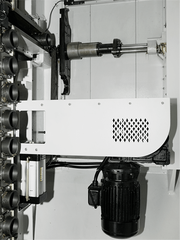 交換工作臺裝置采用直接抬起回轉(zhuǎn)方式,工作臺交換時間10s(HPC650),大大降低了輔助加工時間,龍門框架支撐,避免因偏載對交換裝置產(chǎn)生影響,回轉(zhuǎn)采用伺服電機(jī)驅(qū)動,控制精確,回轉(zhuǎn)穩(wěn)定。